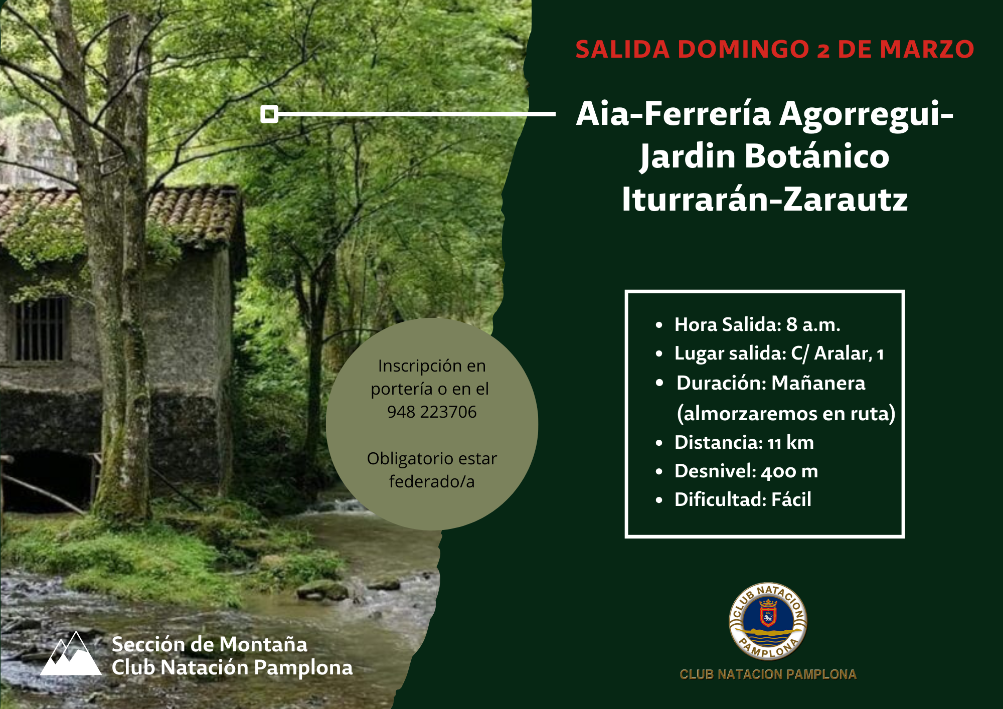 En total recorrermos 11 kilómetros con un desnivel de 400 metros. Se trata de una salida mañanera de intensidad fácil. La salida será a las 08,00 de la C/ Aralar nº1. Las inscripciones ya se pueden realizar en portería y en el 948 223706. Para participar es obligatorio estar federado/a.