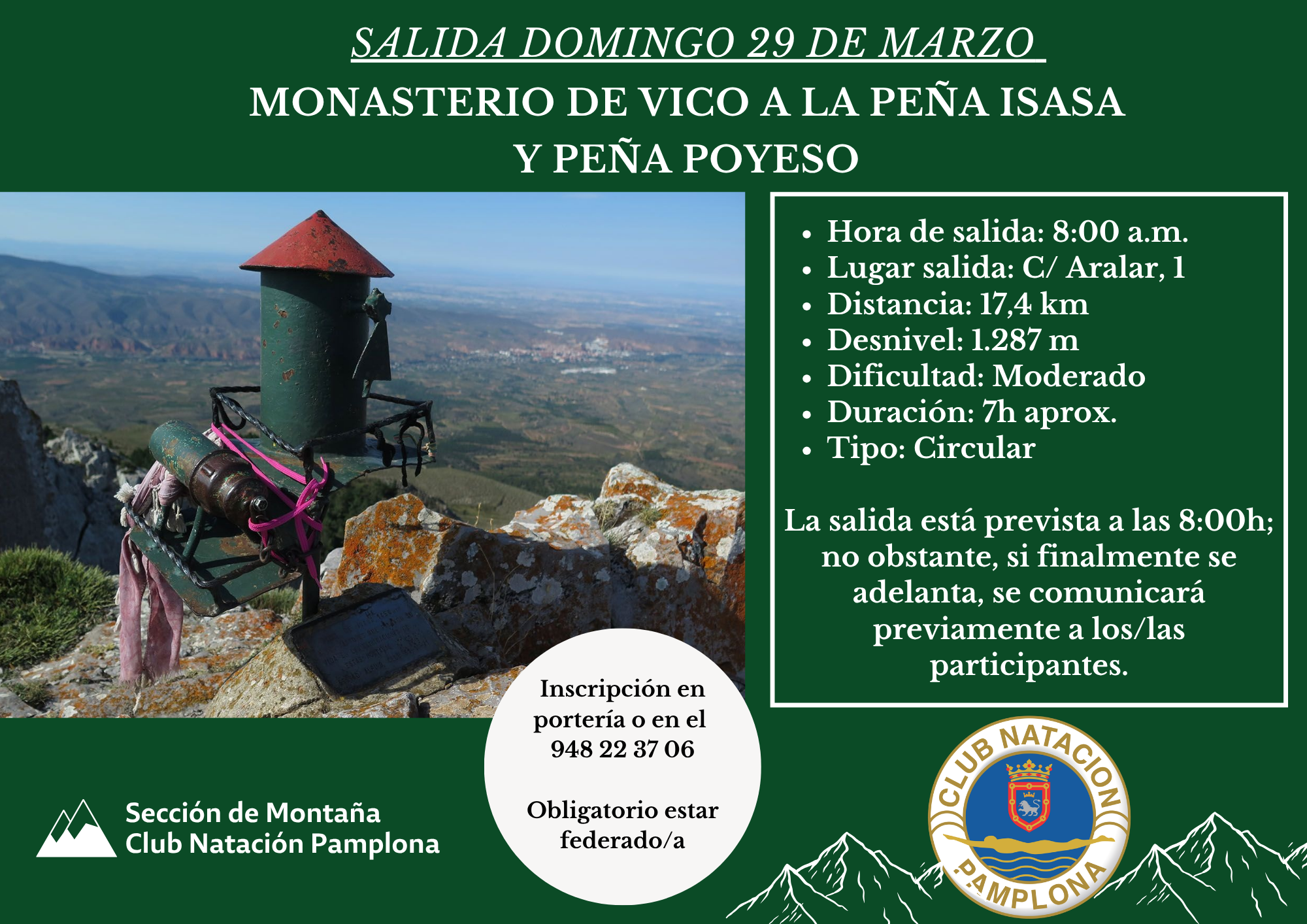 El próximo domingo 29 de marzo, nuestra sección de Montaña organiza una nueva salida desde el Monasterio de Vico hasta Peña Isasa y Peña Poyeso, en un recorrido circular exigente pero muy atractivo por su valor paisajístico.