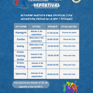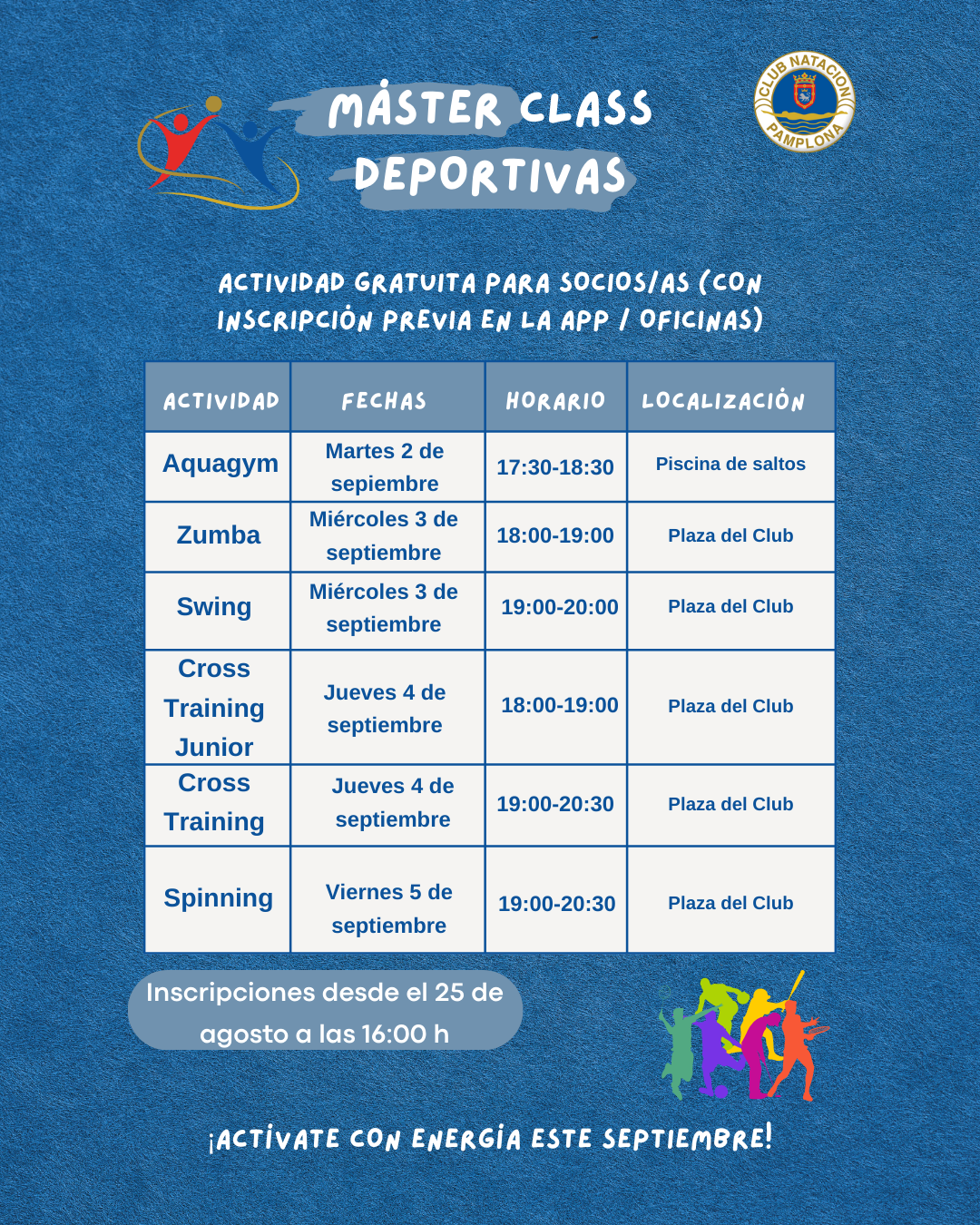 El Club Natación Pamplona organiza una serie de máster class deportivas para dar la bienvenida al mes de septiembre de una forma activa. Estas sesiones, dirigidas a socios y socias del Club, son de acceso libre, aunque requerirán inscripción previa a través de la app del Club o en oficinas.