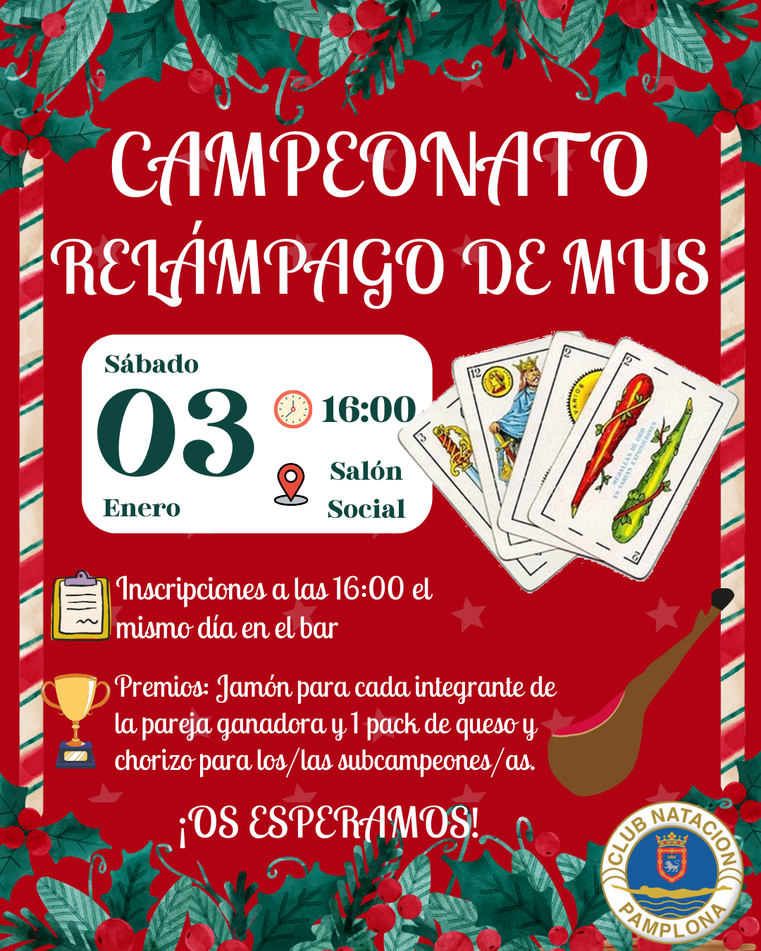 El próximo sábado 3 de enero, llega al Club el tradicional Campeonato Relámpago de Mus “Del Jamón”, una competición divertida y con grandes premios para disfrutar en buena compañía.