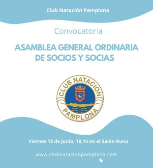 La Junta Directiva del Club Natación Pamplona convoca a todos los socios y socias a la Asamblea General Ordinaria, que se celebrará en el Salón Runa del Club el próximo viernes 13 de junio. La sesión tendrá lugar a las 18:00 horas en primera convocatoria y a las 18:15 horas en segunda.