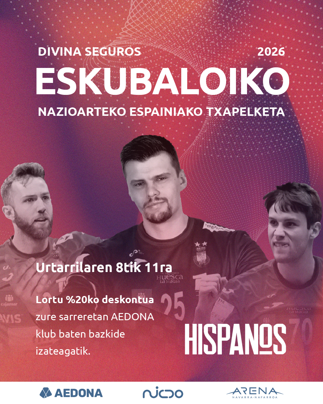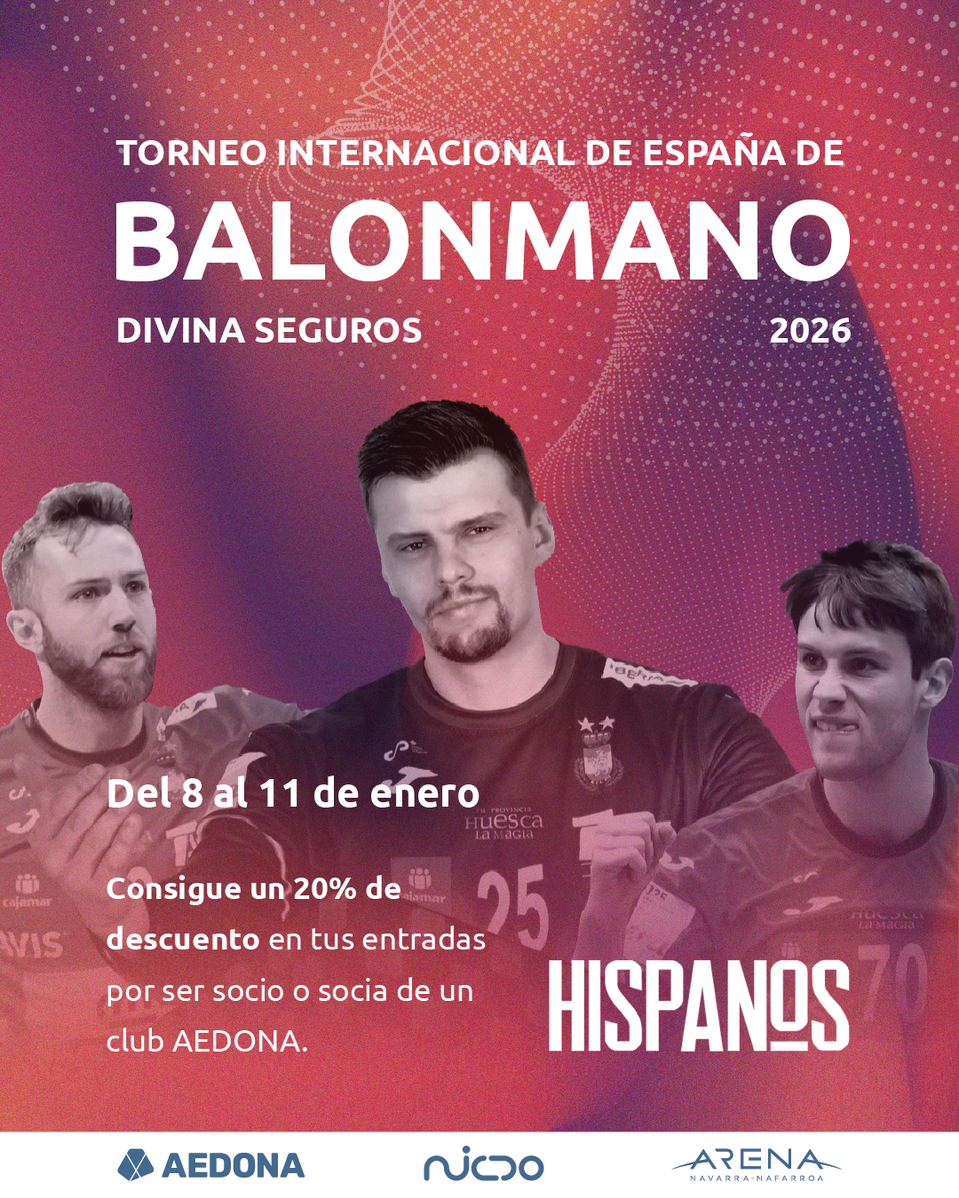 Entradas: Las individuales son por día y se puede disfrutar de toda la jornada con varios partidos. Los socios/as del Club tienen un 20% de descuento presentando el carnet/app de socio en taquilla o usando el código AEDONABALONMANO en la web oficial del Navarra Arena.