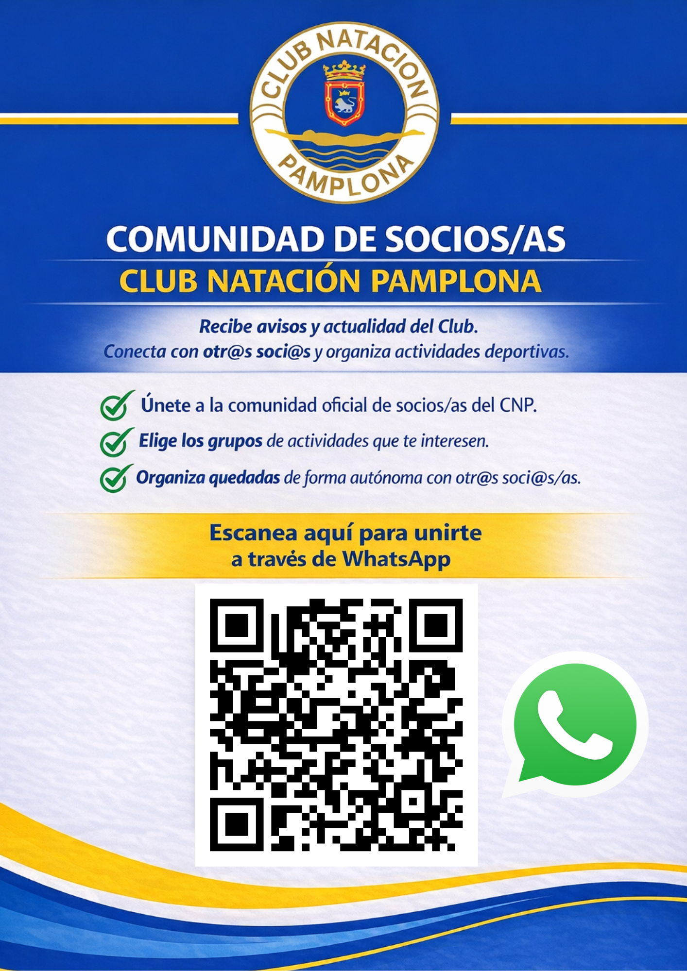 Desde el Club Natación Pamplona lanzamos una nueva Comunidad de WhatsApp para socios/as, con el objetivo de mejorar la comunicación, fomentar la participación y reforzar la vida social y deportiva del Club.