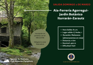 Para este domingo 2 de marzo nuestra sección de Montaña nos propone una bonita ruta por Gipuzkoa. Partiremos del pueblo de Aia, donde visitaremos La zona de ferrerías y molinos hidráulicos de Agorregi. Posteriormente llegaremos al Jardín Botánico de Iturraran en el Parque natural de Pagoeta, y finalizaremos la excursión en Zarautz.