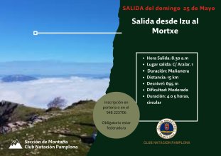 Para este domingo 25 de mayo nuestra sección de Montaña nos propone una bonita salida cerca de Pamplona: haremos el trayecto desde Izu al monte Mortxe. Se trata de una excursión de entre cuatro y cinco horas de duración y 15 kilómetros de recorrido de dificultad moderada.