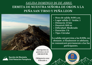 El próximo domingo 26 de abril, la sección de Montaña del Club organiza una nueva salida que recorrerá la Ermita de Nuestra Señora de Okon hasta la Peña San Tirso y Peña León.