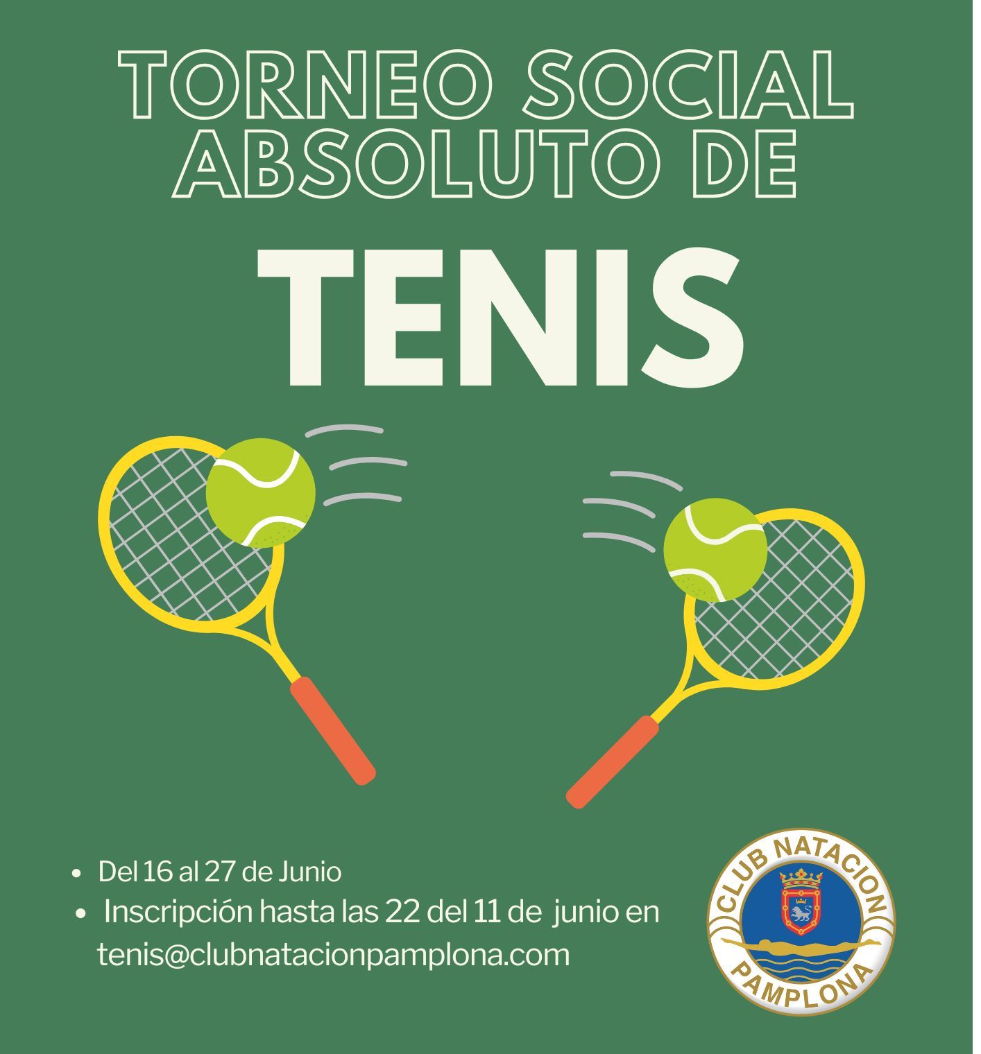 La inscripción tiene un coste de 4,50 € y podrá realizarse hasta las 22:00 h del miércoles 11 de junio, escribiendo al correo de la sección: 📧 tenis@clubnatacionpamplona.com