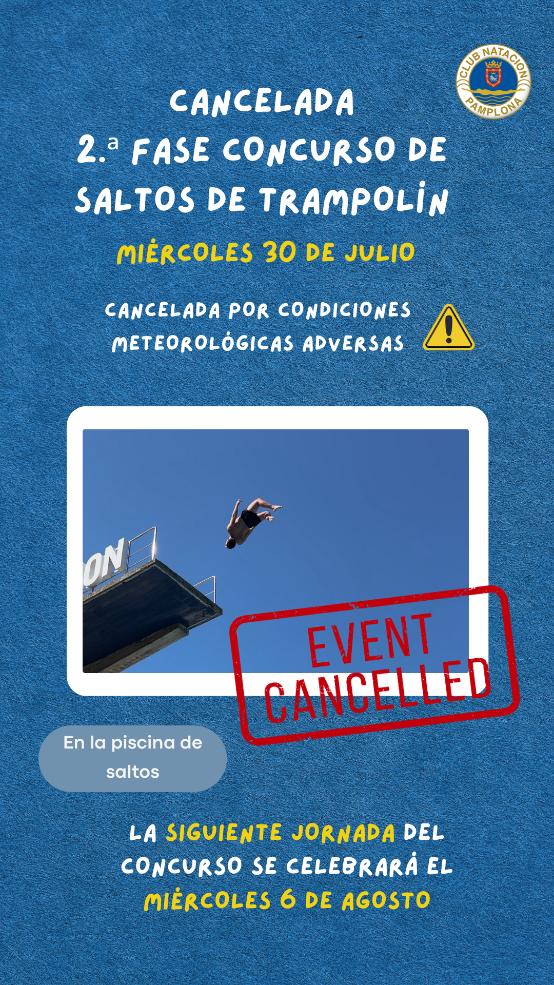 Lamentamos comunicar que, debido a las malas condiciones meteorológicas, la segunda fase del Concurso de Saltos de Trampolín “Baldomero Barón”, prevista para hoy miércoles 30 de julio, ha tenido que ser cancelada.