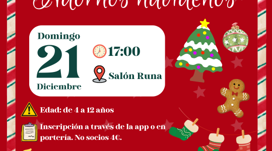 Dirigido a socios/as de 4 a 12 años Niños no socios también pueden participar, con un coste de 4€ Inscripción previa en la app móvil o en portería¡No os lo perdáis y venid a crear adornos ingeniosos y muy divertidos!