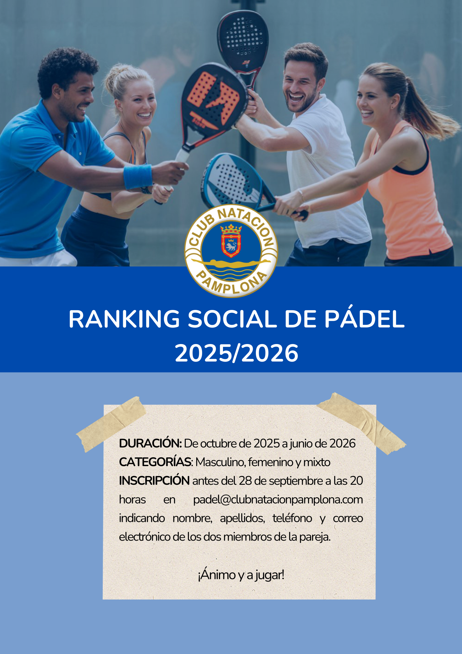 Los socios y socias del Club podrán inscribirse hasta el 28 de septiembre a las 20 horas en el e-mail padel@clubnatacionpamplona.com indicando nombre, apellidos, teléfono y correo electrónico de los dos miembros de la pareja. La competición se desarrollará entre octubre de 2025 y junio de 2026 en las categorías mixta, femenina y masculina.