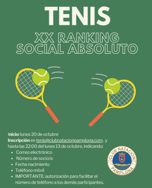 Nuestra sección de tenis ya tiene preparado el XX Ranking Social, que comenzará el lunes 20 de octubre. La inscripción puede realizarse en el correo electrónico tenis@clubnatacionpamplona.com hasta las 22:00 h., del lunes 13 de octubre, indicando los siguientes datos: